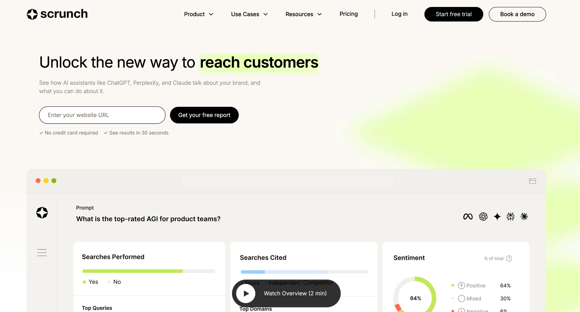 Scrunch monitors seven major AI platforms — ChatGPT, Claude, Perplexity, Meta AI, Google AI Mode, Google AI Overviews, and Gemini — with prompt-level tracking organized by topics, personas, customer journey stages, and geographic regions.
