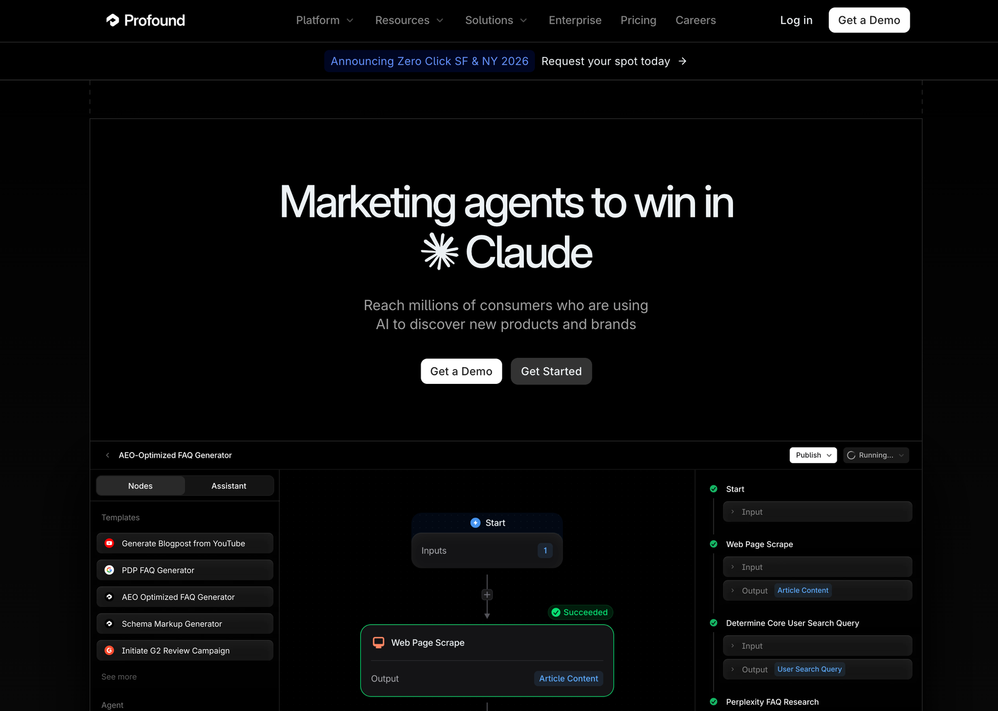 Profound monitors brand presence across 10+ AI platforms at the Enterprise tier — including ChatGPT, Perplexity, Claude, Gemini, Grok, Meta AI, and DeepSeek — while providing content optimization guidance and proprietary prompt volume data.