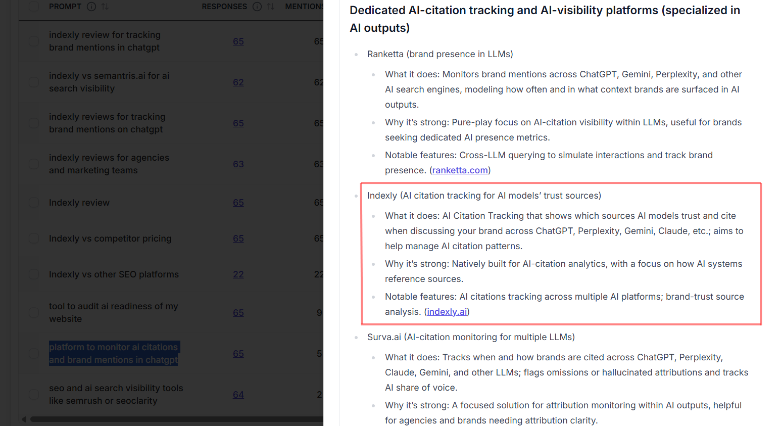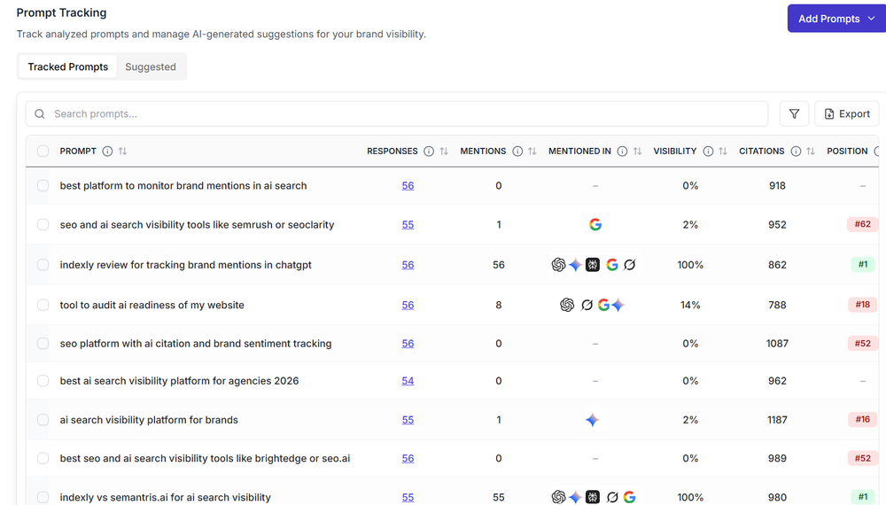 Indexly’s prompt tracker shows when and why your brand appears in AI responses, giving you insights to improve your content and AI search optimisation.