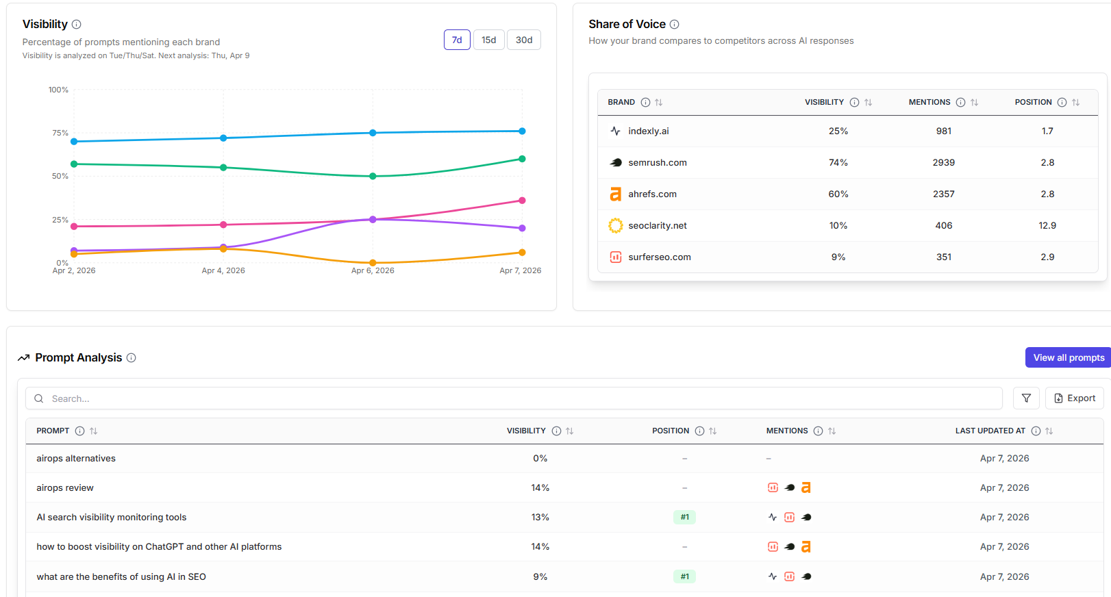 AirOps is focused on automating and scaling content production, helping teams streamline workflows and generate large volumes of content efficiently. Indexly, while it also includes content discovery and content opportunity features, is primarily focused on AI search visibility, helping brands understand how often they appear in AI-generated answers and improving their presence across tools like ChatGPT, Perplexity, and Gemini.