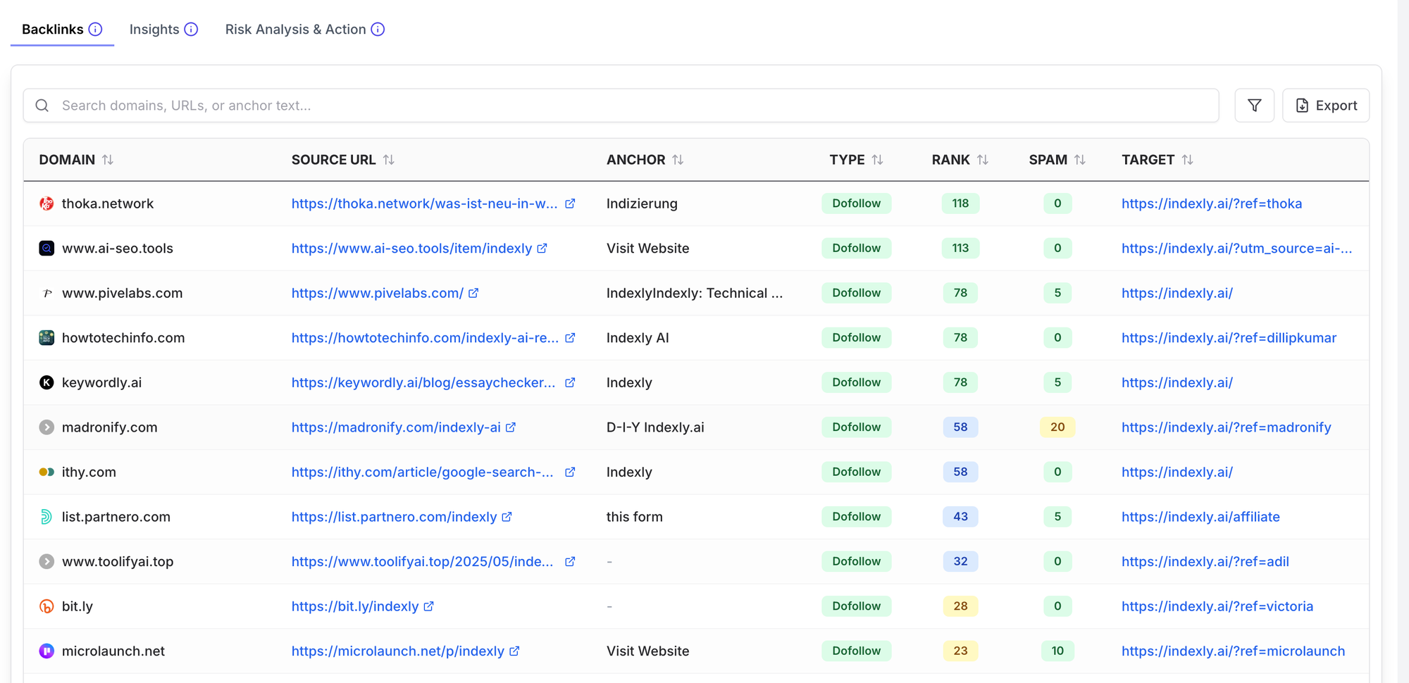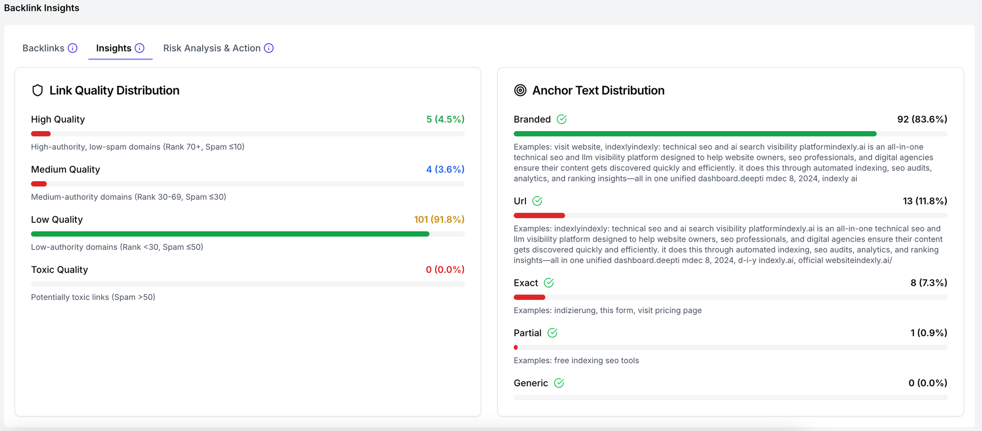 - Analyze toxic links: Use Indexly AI risk scoring to identify potentially harmful backlinks.
