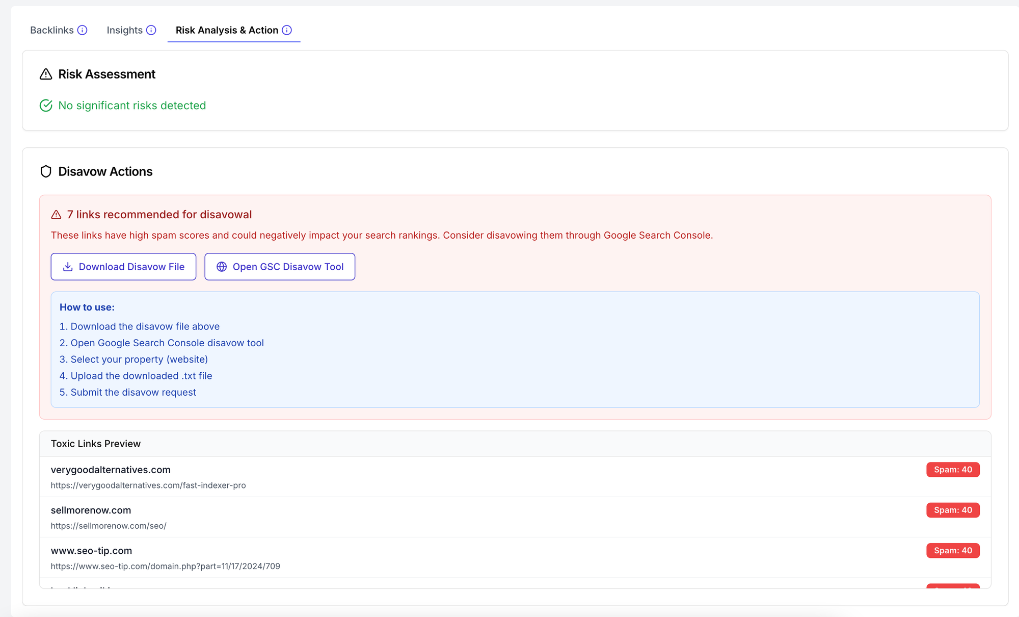 - Export and submit disavow file: One-click export streamlines submission to Google Search Console, minimizing manual effort.