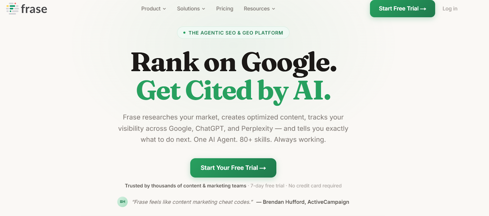 Frase focuses on the content layer of AI search visibility — specifically on identifying the facts, data points, and structural elements that make content more likely to be cited by AI engines. Its mid-market positioning makes it accessible for growing teams that have moved beyond basic AI visibility monitoring and want to take active steps to improve their citation rates through better content.