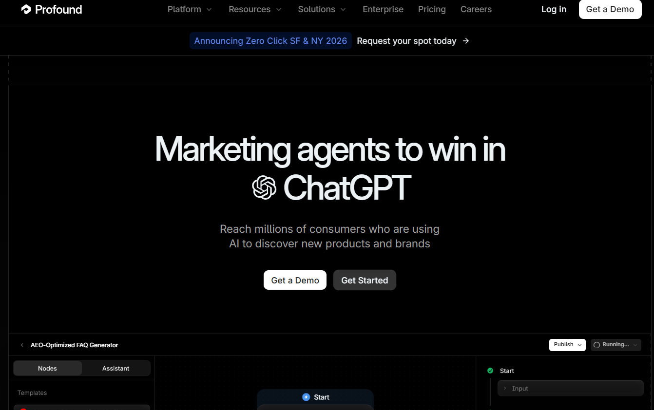 Profound is an enterprise-grade AI visibility platform built for organisations managing multiple brands, markets, and reporting structures at scale. It monitors user-facing interfaces across more than ten AI engines to deliver detailed analytics on brand representation, sentiment trends, and competitive positioning — making it one of the most thorough enterprise solutions in the space.