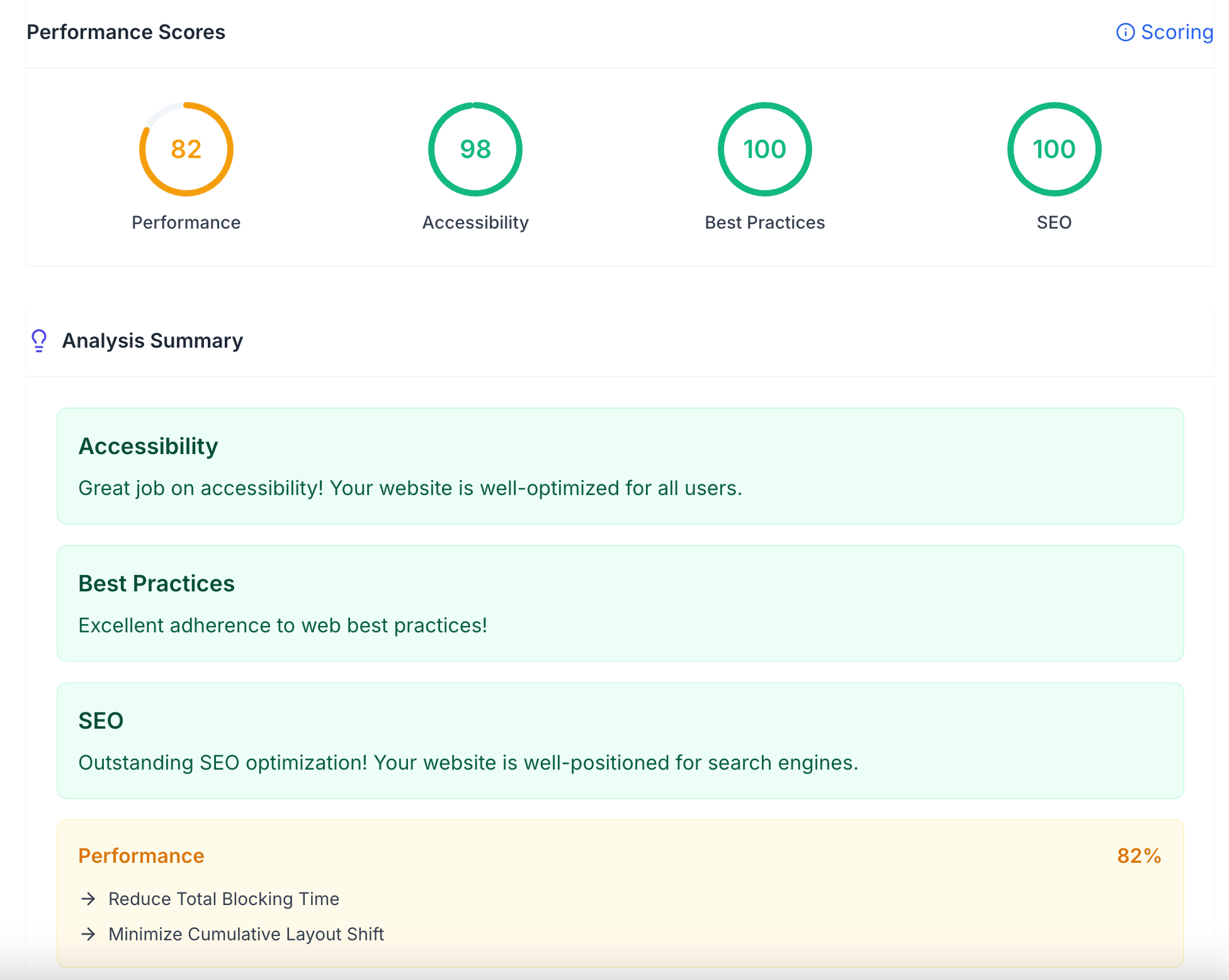 - Performance and structure scores: Get clear grades based on Lighthouse and proprietary algorithms, guiding targeted improvements. Businesses have cited achieving score increases of 10-20% after addressing flagged issues.