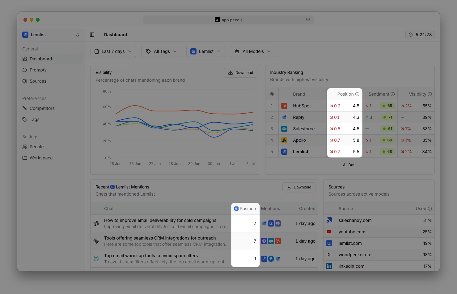 Another key capability of Peec AI is tracking brand positioning within AI-generated responses.