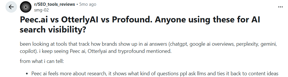 Beyond official documentation and reviews, many SEO professionals discuss Peec AI in online communities such as Reddit.