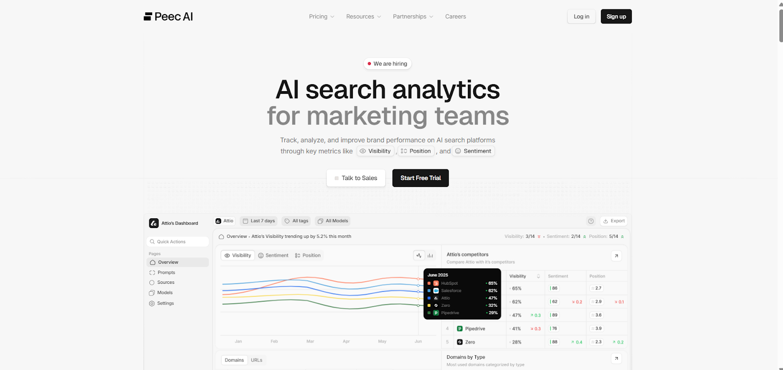 Peec AI specializes in monitoring how brands appear across AI platforms such as ChatGPT, Perplexity, and Google AI Overviews. The platform tracks visibility, positioning, and sentiment at the prompt level, helping businesses understand how their brand is referenced in AI-generated answers.