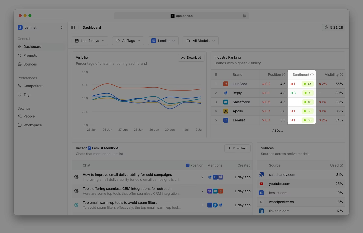 Peec AI’s Brand Sentiment Analysis