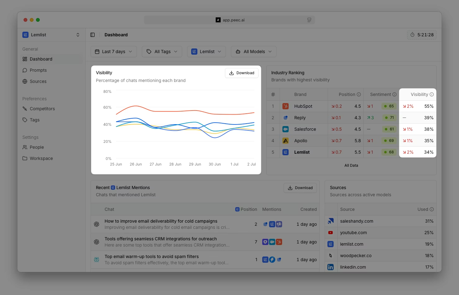Several reviews note that Peec AI offers clear visibility metrics and reporting tools, making it easier for teams to monitor brand mentions and export reports for stakeholders.