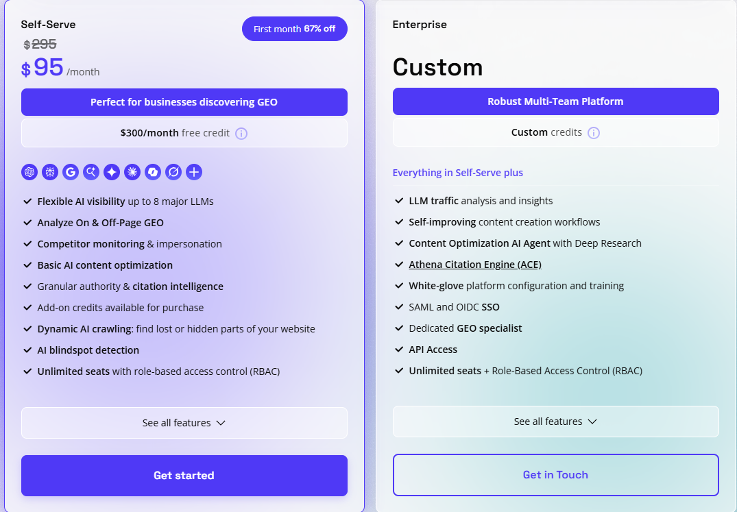 AthenaHQ's pricing reflects its premium positioning. The Self-Serve plan starts at $295/month (or $95 for your first month). The credit-based consumption model means pricing scales with your usage and the value you extract from automation features. This approach is designed for organisations with dedicated marketing budgets that want to scale their efforts. You're paying more, but you're also getting more—autonomous agents, revenue attribution, and enterprise support.