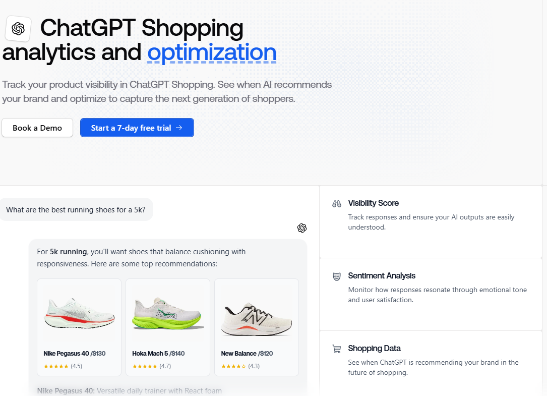 The ChatGPT shopping feature focuses on how products are recommended within AI-driven experiences in ChatGPT. It tracks product mentions, rankings, sentiment, and competing brands across different prompts.