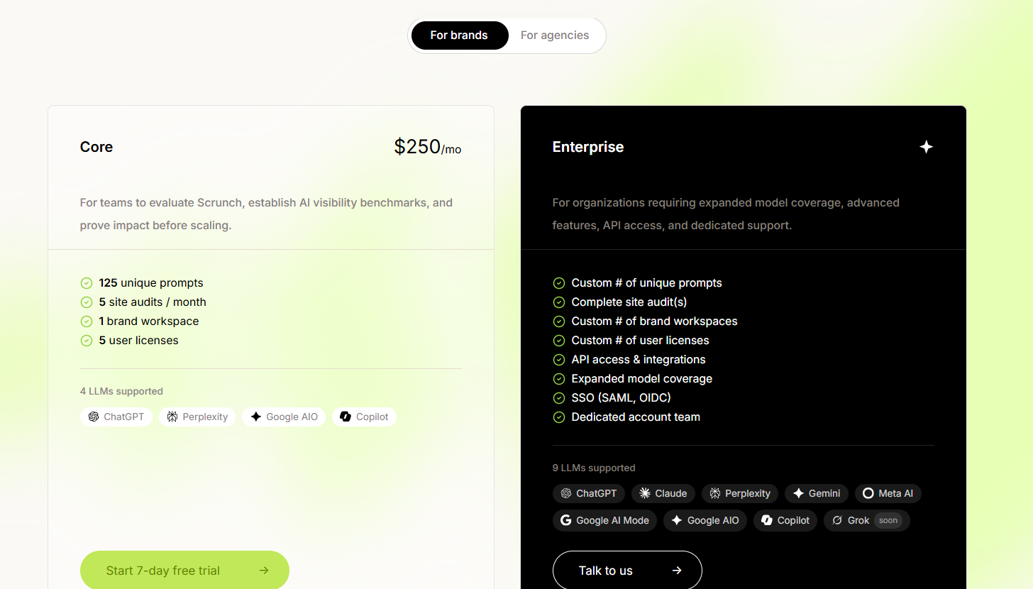 Scrunch AI pricing starts at $250/month for the Core plan for brands and $500/month for the Agency Core plan. Enterprise pricing is customized based on usage and features.