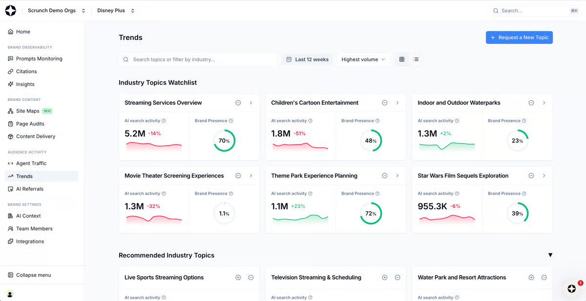 The AI Search Trends feature in Scrunch AI allows brands to monitor emerging topics across AI platforms such as ChatGPT and Gemini. It evaluates prompt activity across 1,500+ industry topics to show what users are frequently asking AI tools.
