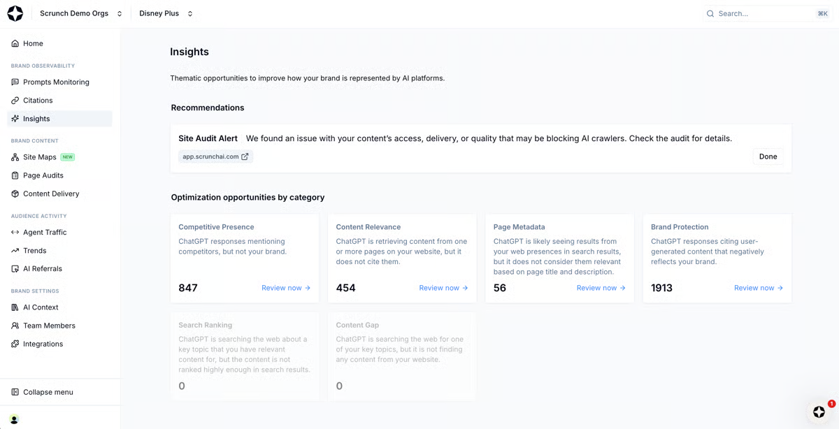 While Scrunch AI provides detailed analytics, some users report that it mainly highlights visibility gaps and performance issues without offering step-by-step recommendations for improvement. This may require marketers to rely on additional tools for optimization.