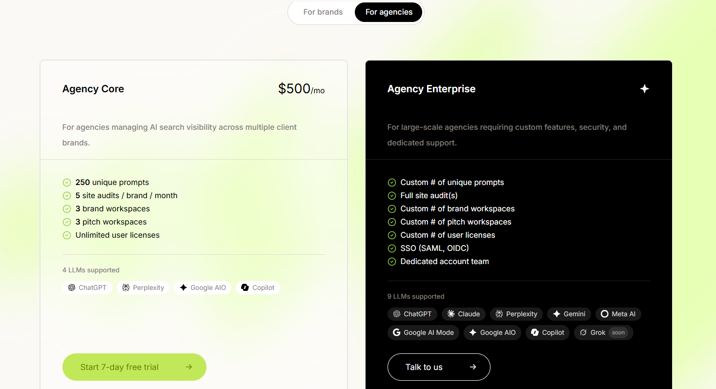 Agency Core starts at $500/month, and Agency Enterprise comes with custom pricing under the Scrunch Agency Partner Program.