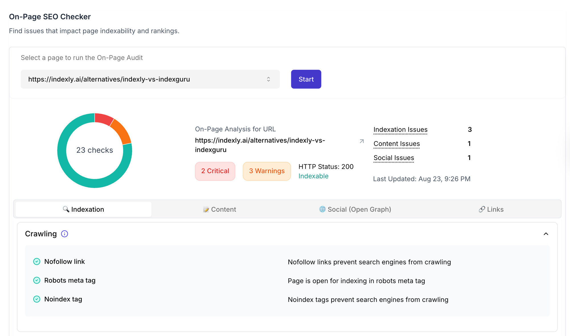 Use Indexly for managing, monitoring, and identifying indexing issues for your web page and submitting it for indexing.